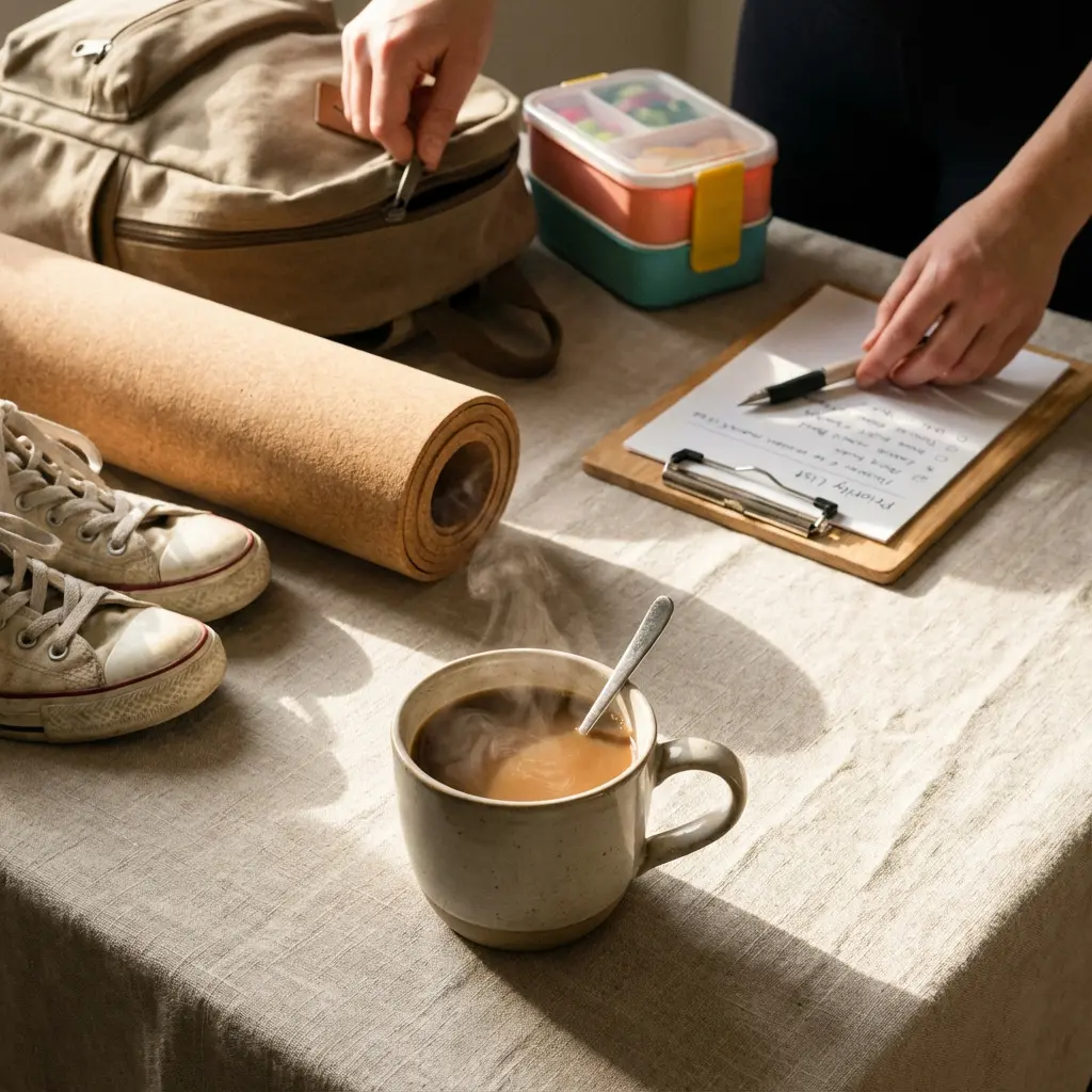 Legen Sie am Abend Dinge für den nächsten Tag bereit (Kleidung, Lunch), planen Sie 1–3 Prioritäten und reduzieren Sie Bildschirmzeit in der Stunde vor dem Schlafen. Das senkt Morgenstress und Chaos deutlich und stärkt Ihre Abendroutine.