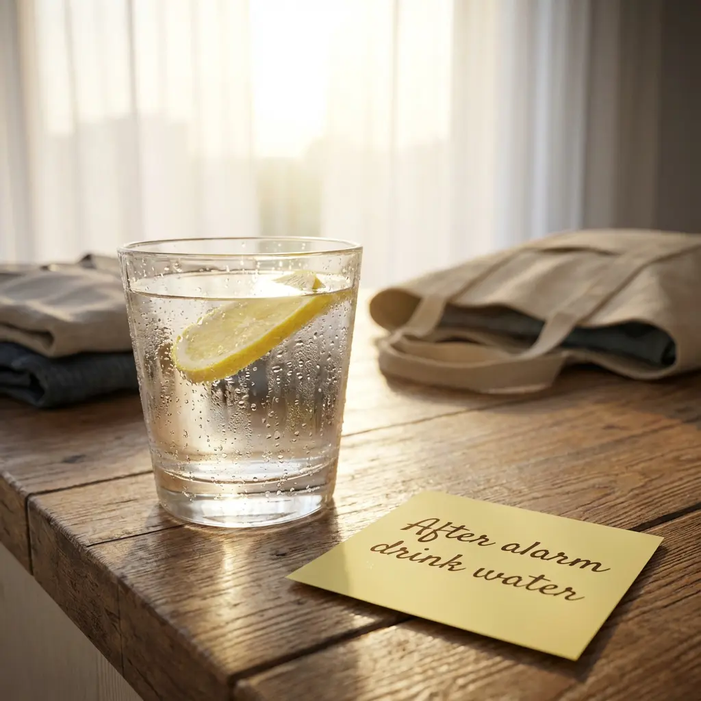 • Hydration: Trinken Sie direkt nach dem Aufstehen ein Glas Wasser (optional mit Zitrone).